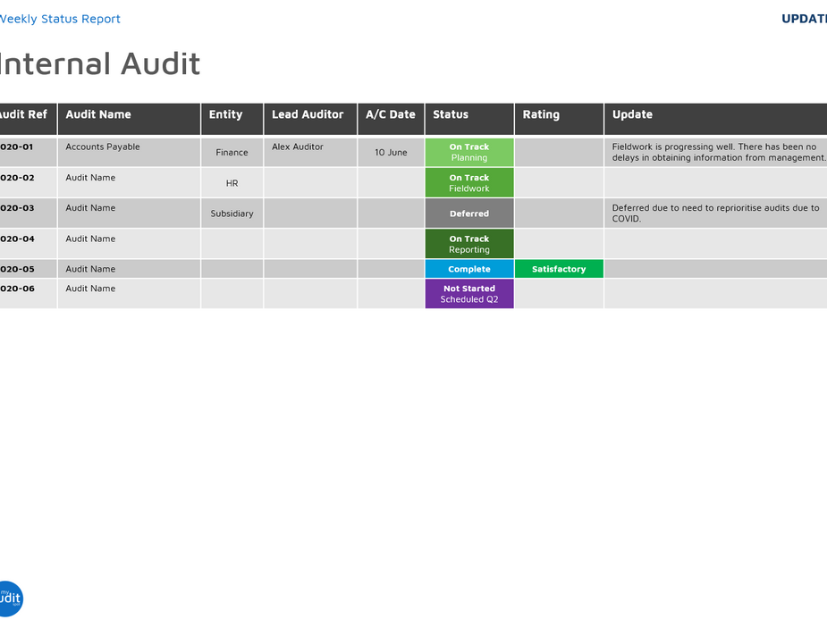 Performing a weekly status update is a great way to ensure all audits are on track and any issues are proactively addressed before its too late. Particularly where you have a large audit team, or a large number of audits in progress, the weekly status update is a great way to stay on top of everything which is going on.